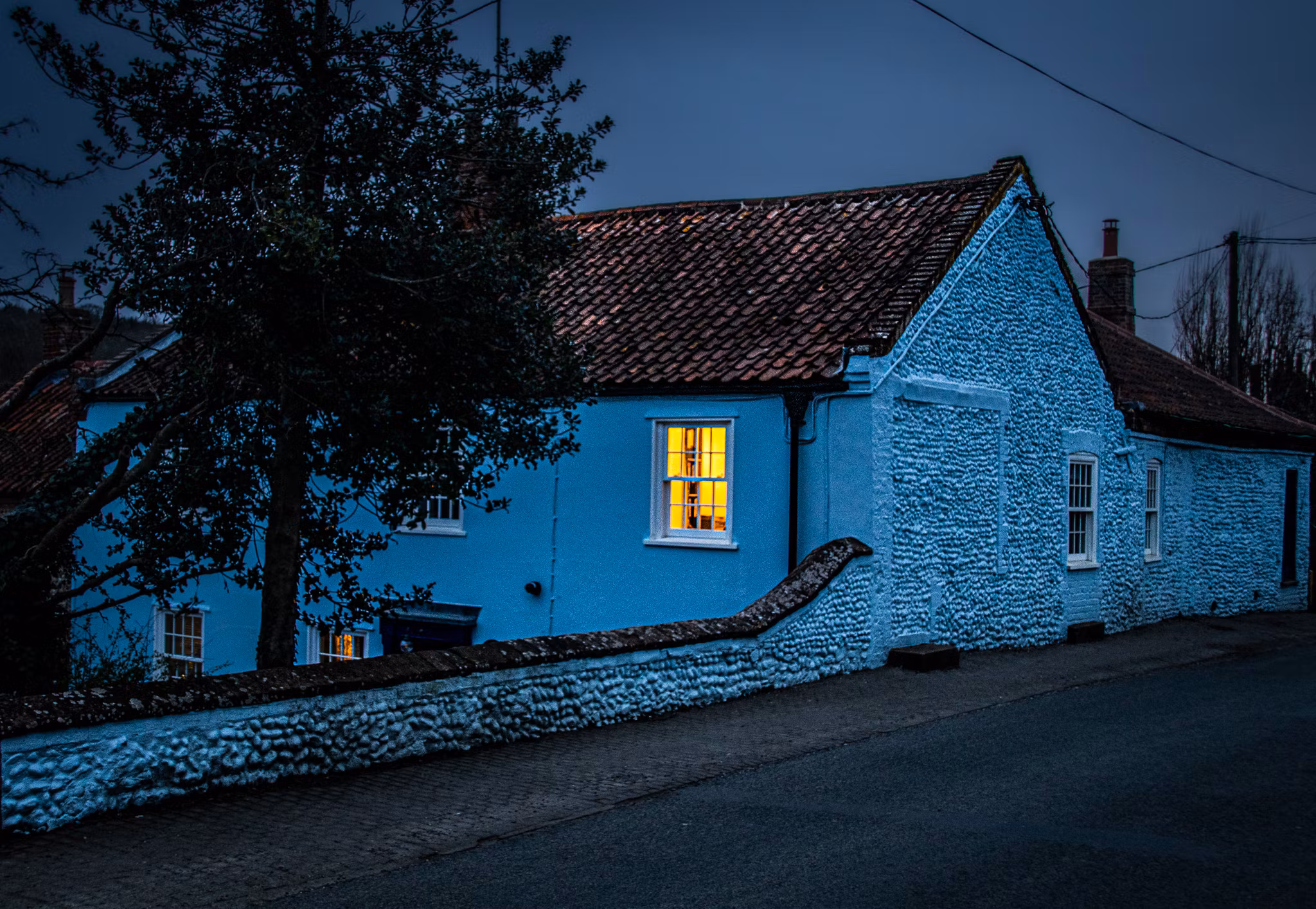 Blått hus i blåtimen, Norfolk, England